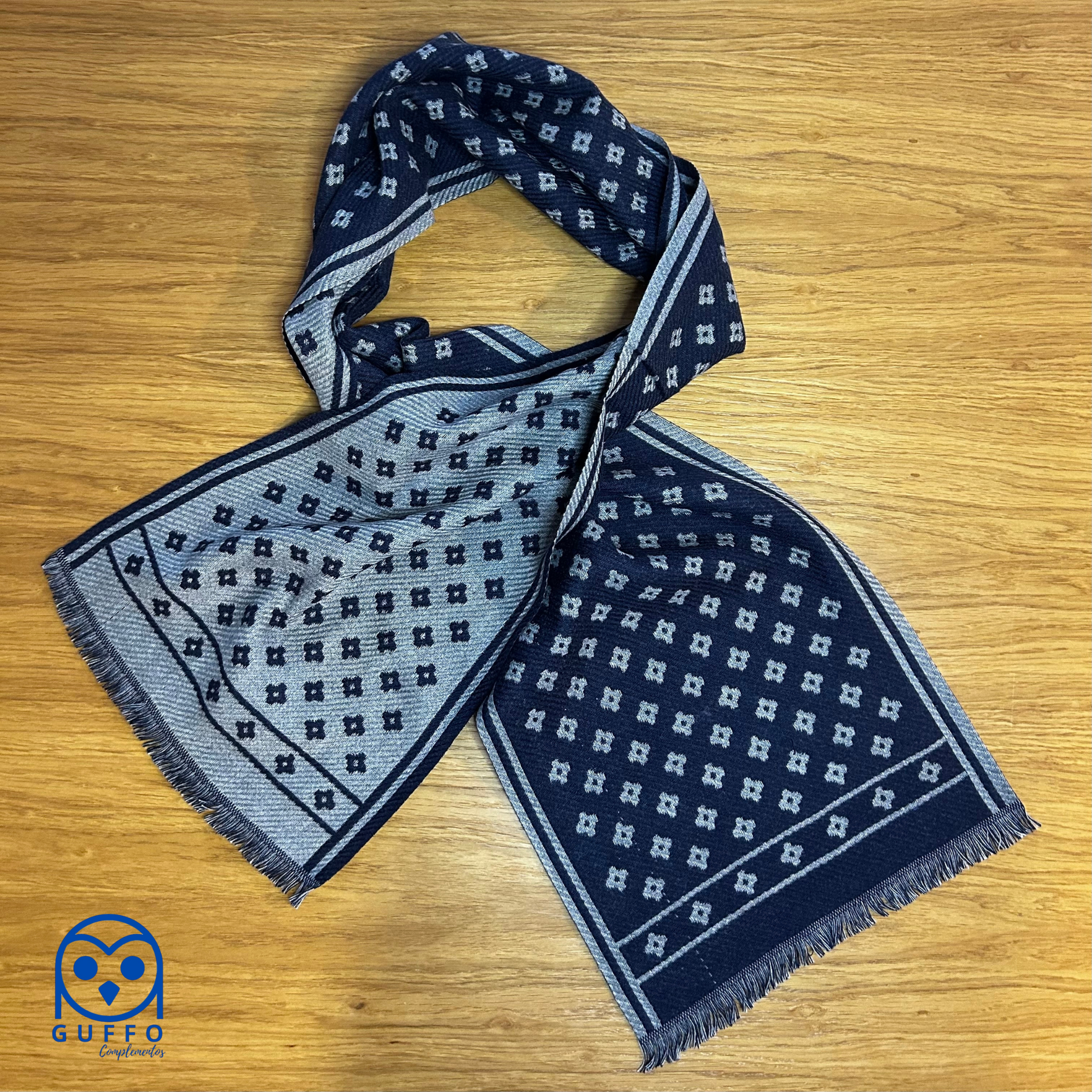 Bufanda fina con un estampado seriado floral en colores gris y azul marino.