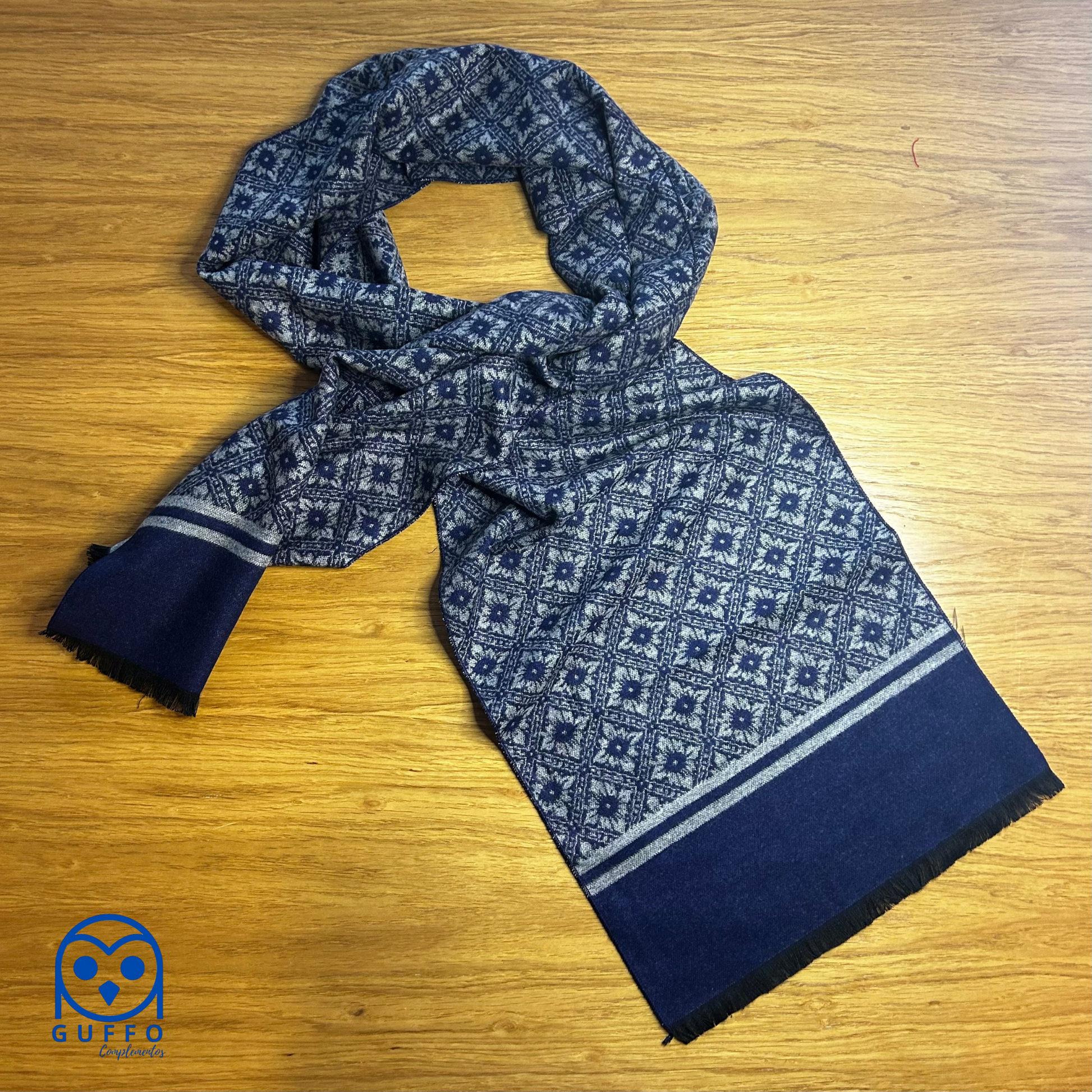 Bufanda fina con un estampado seriado floral en colores gris y azul marino.