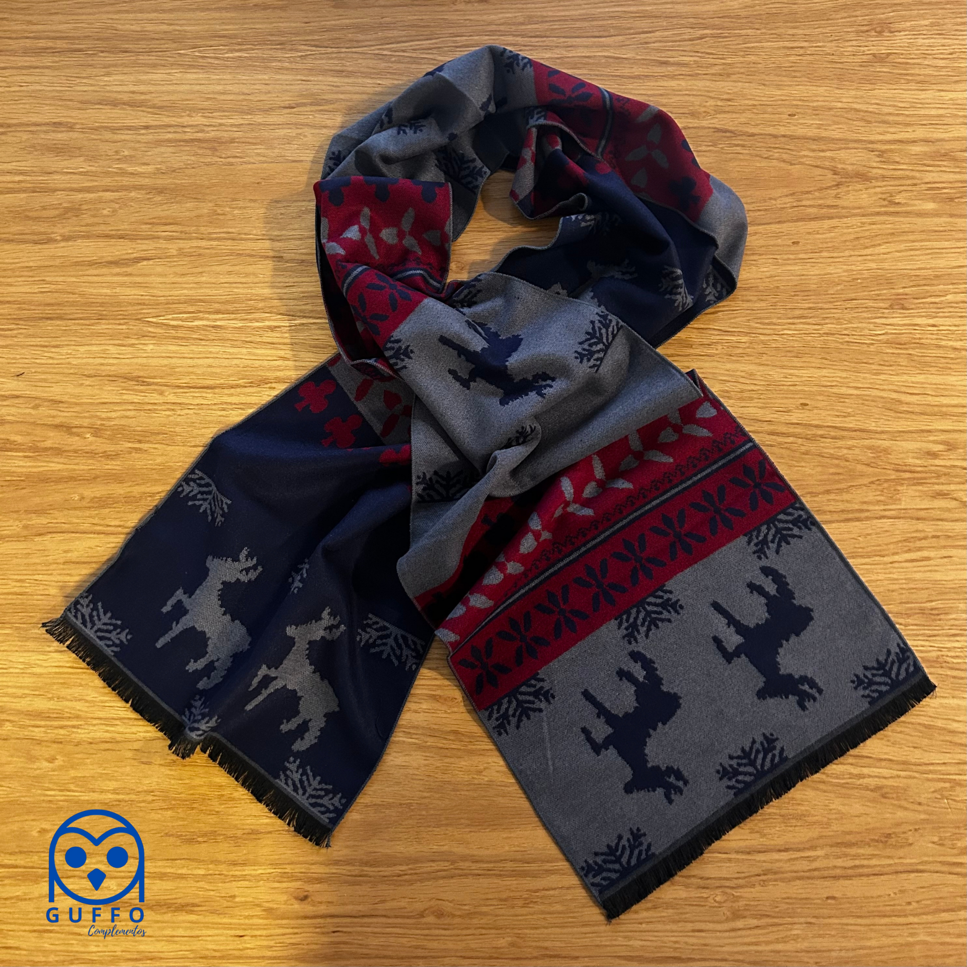Bufanda fina con un estampado geométrico y de renos en colores gris, azul y granate.