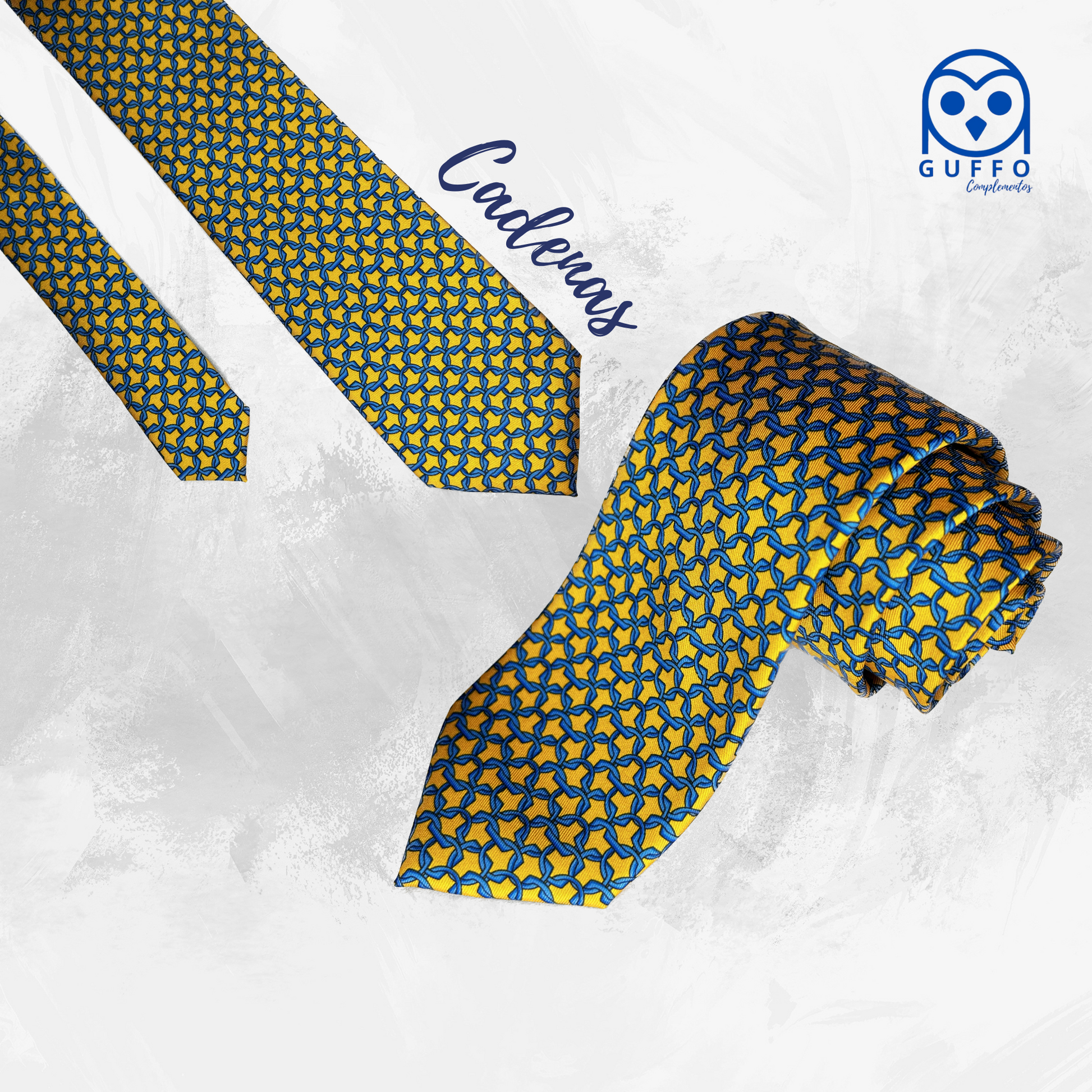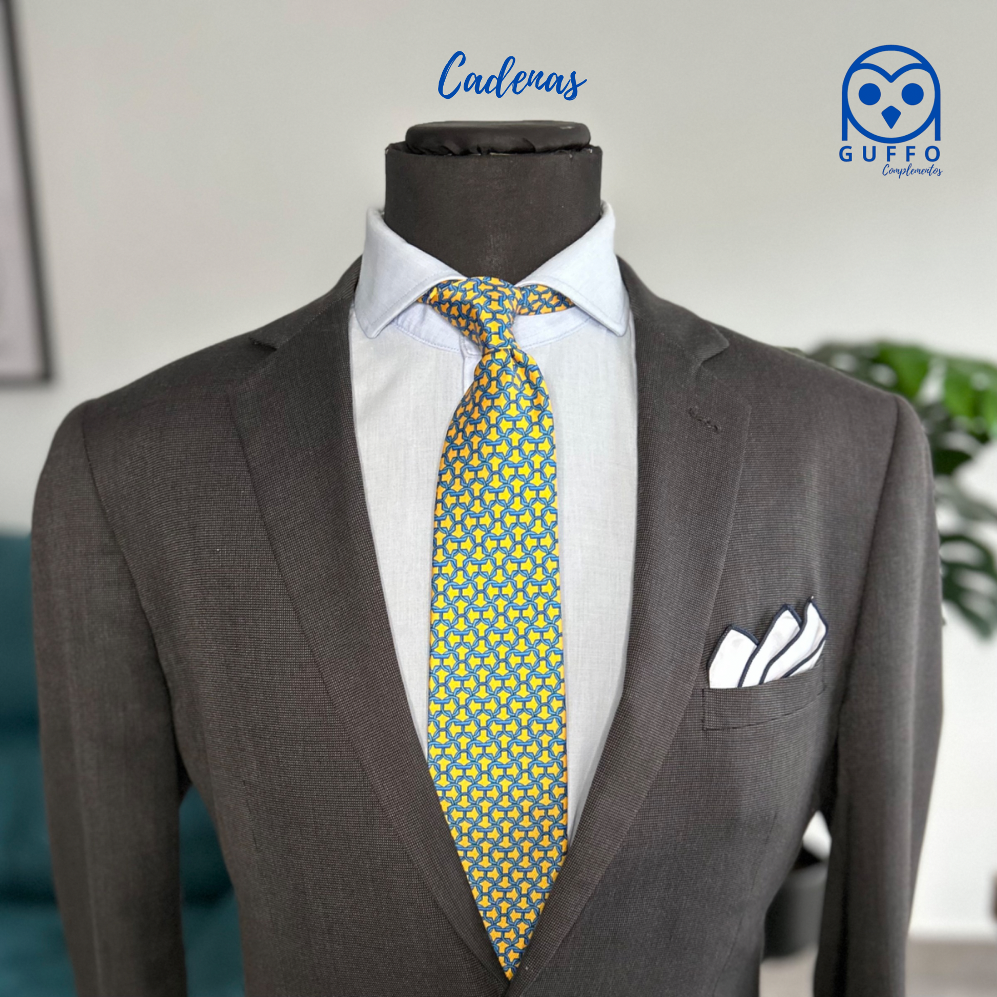 Estampado: Base amarilla con cadenas en tonos celestes.