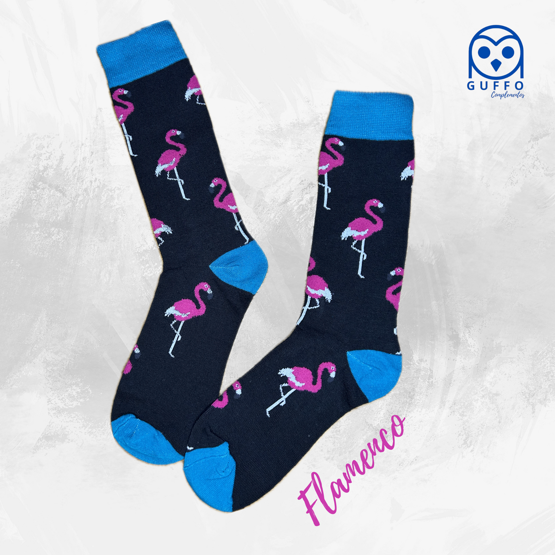 Calcetines de color azul con talón y punta celeste y un dibujo seriado de flamencos rosas.