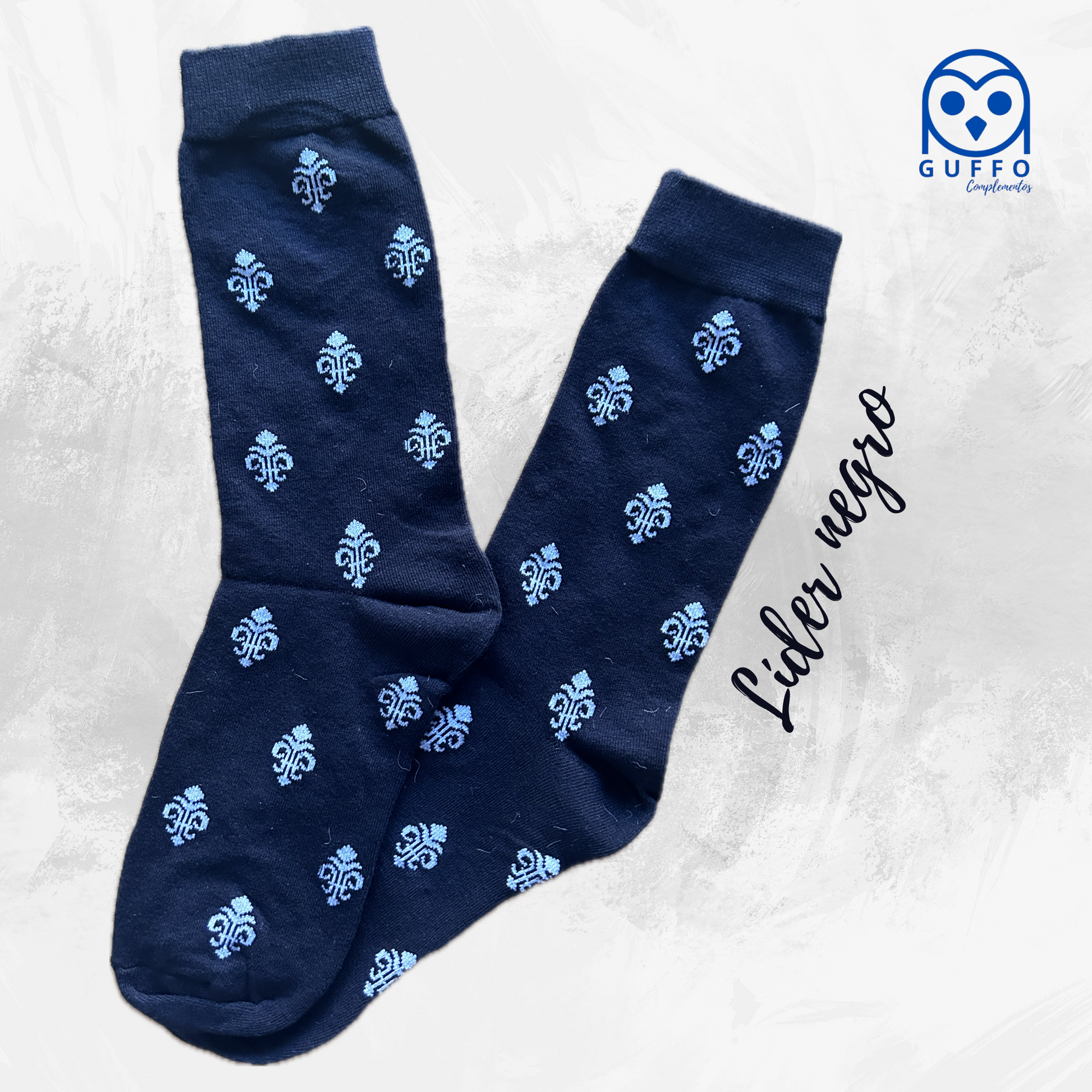 Calcetines de color negro con un dibujo seriado de flores de lís.