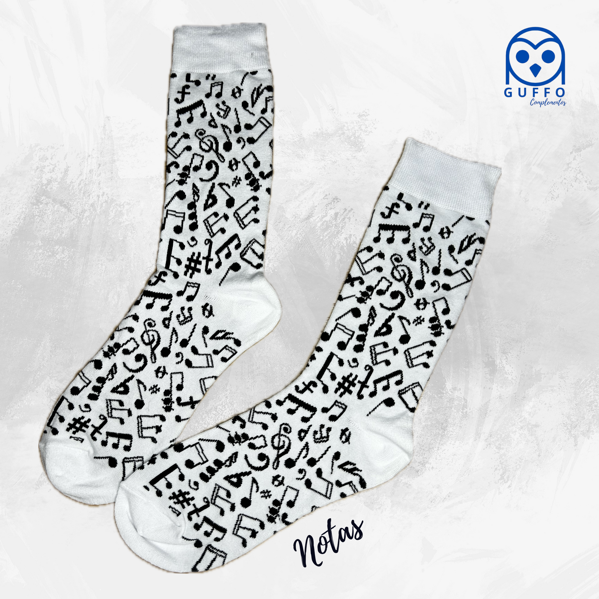 Calcetines de color blanco con un dibujo de notas musicales negras.