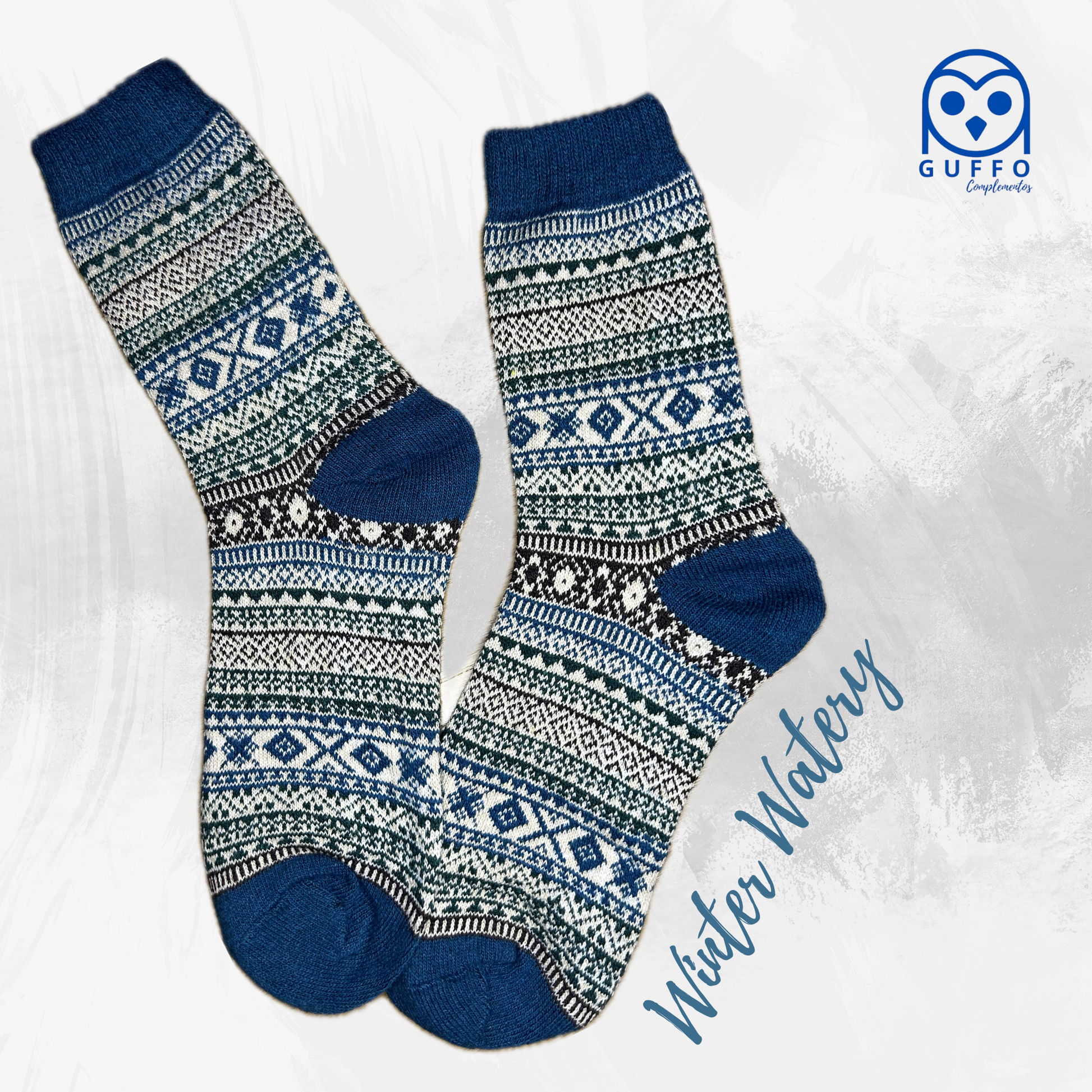 Calcetines de color beige con dibujos étnicos en tonos verde, marrón y verde agua.