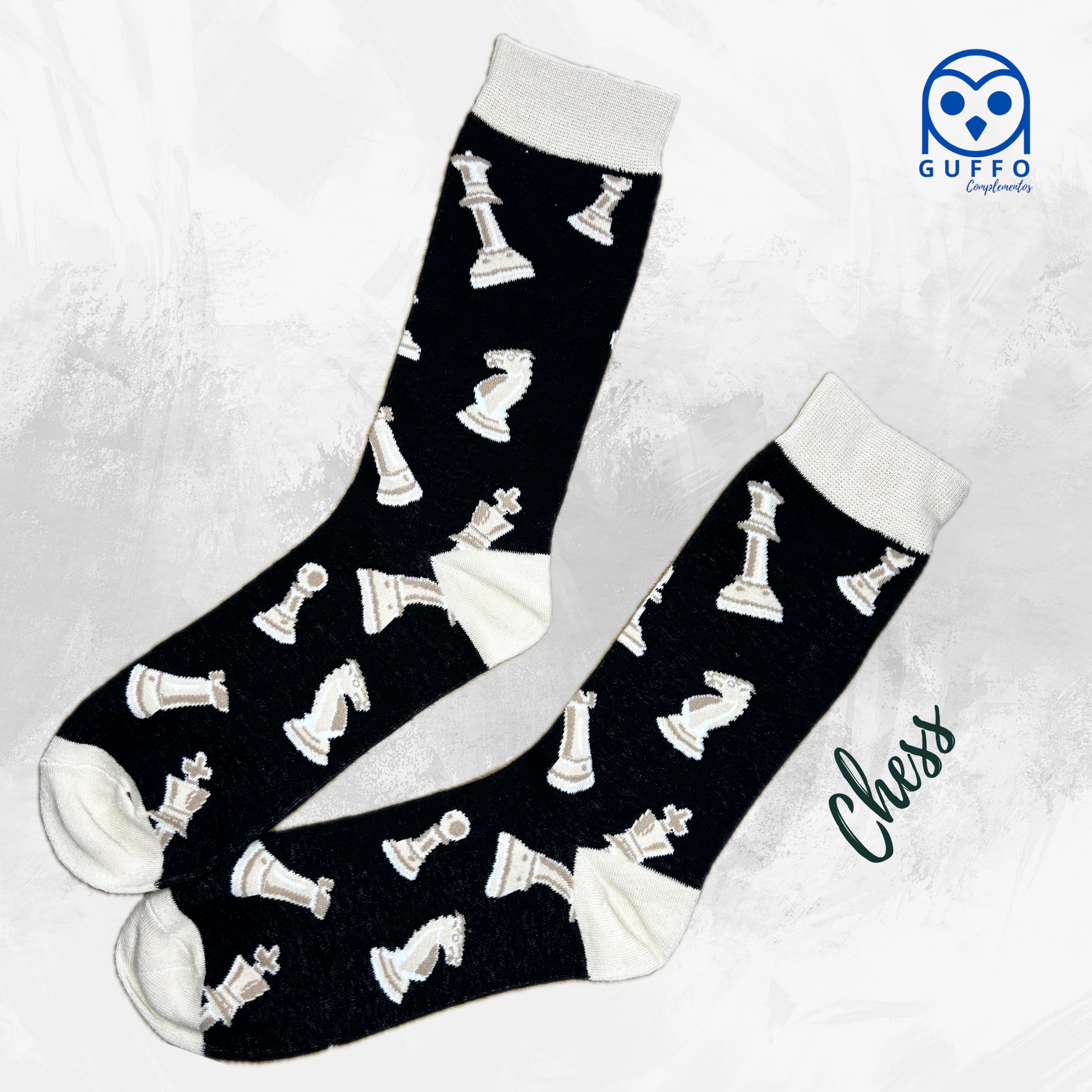 Calcetines de color negro con puntas y talón crudos y con un dibujo seriado de motivos de piezas de ajedrez.