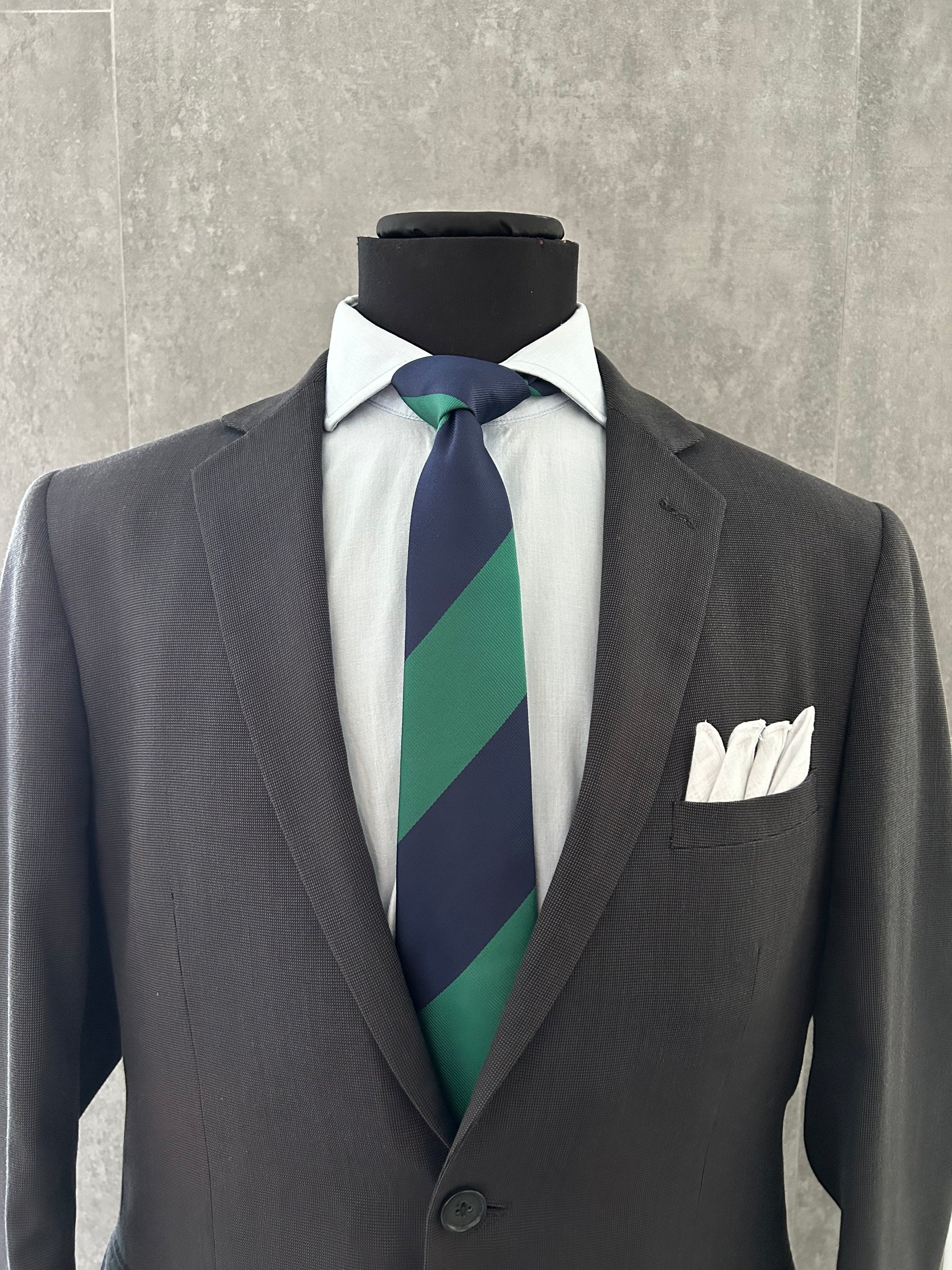 Estampado: Base azul marino con rayas anchas verde primavera.