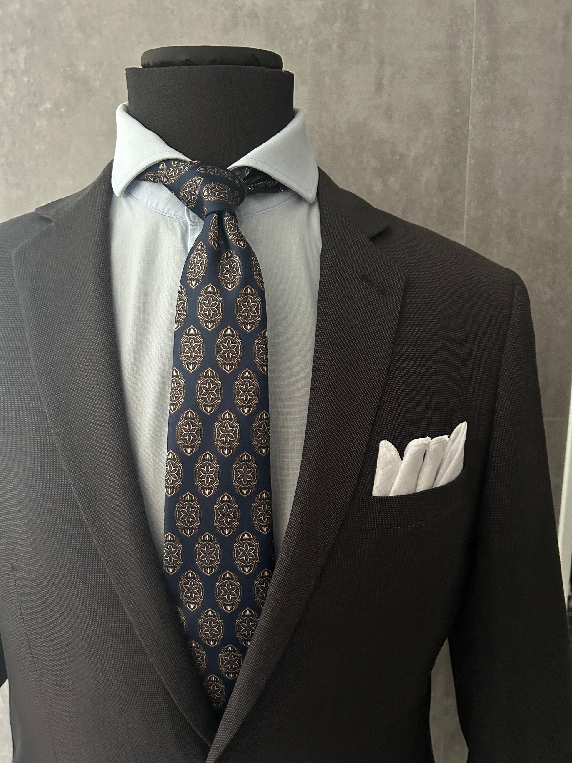 Estampado: Base azul marino con elaborados casetones en tonos marrón.