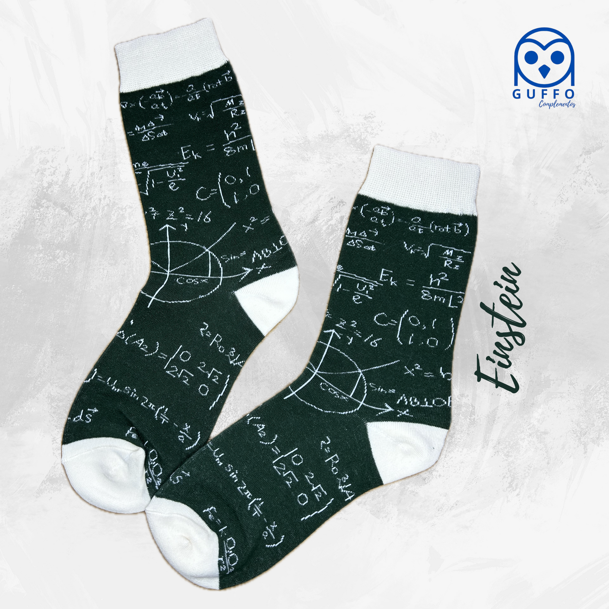 Calcetines de color verde con puntas y talón color blanco, con un dibujo seriado de fórmulas matemáticas.