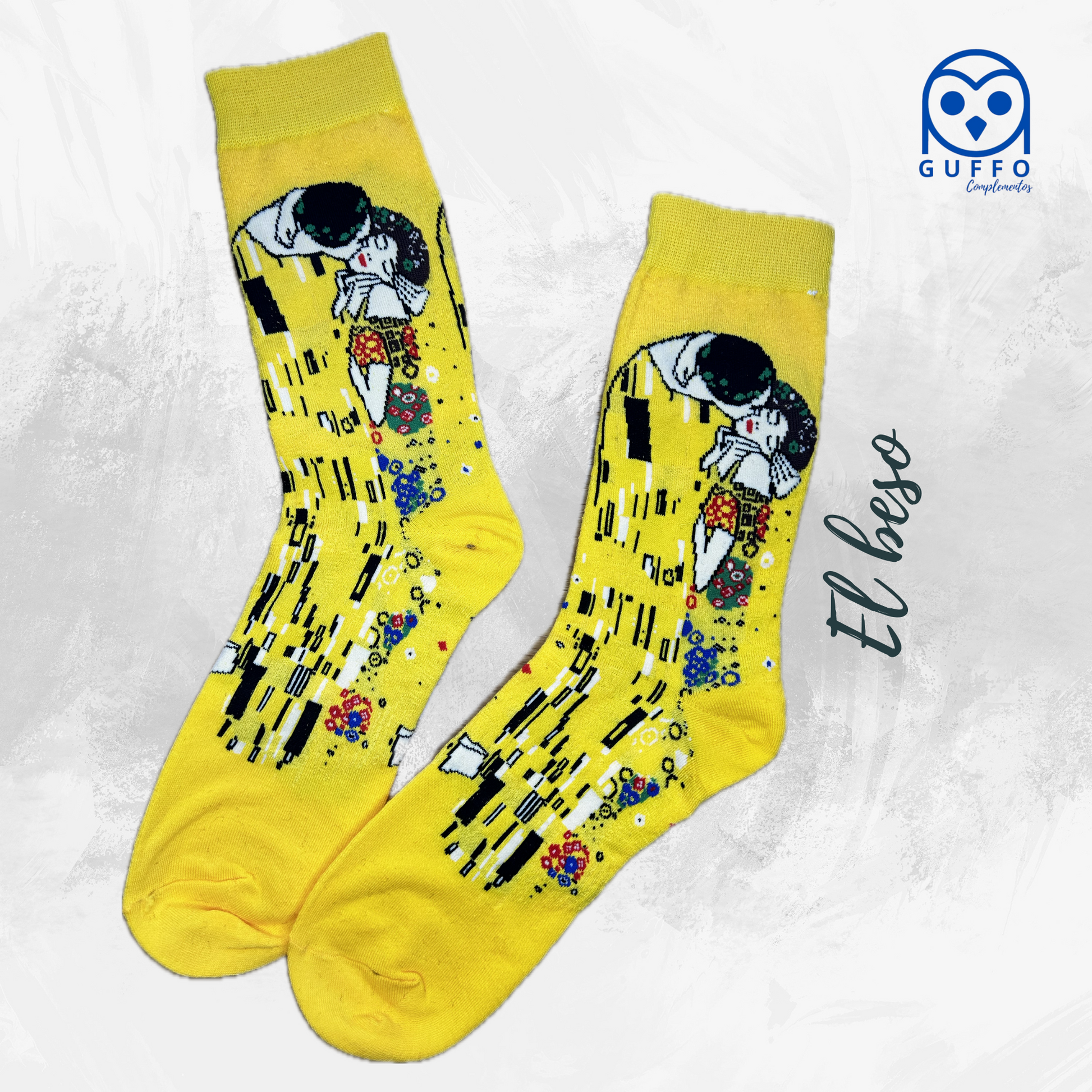 Calcetines de color amarillo con un dibujo inspirado en la obra "El Beso" de Gustav Klimt.