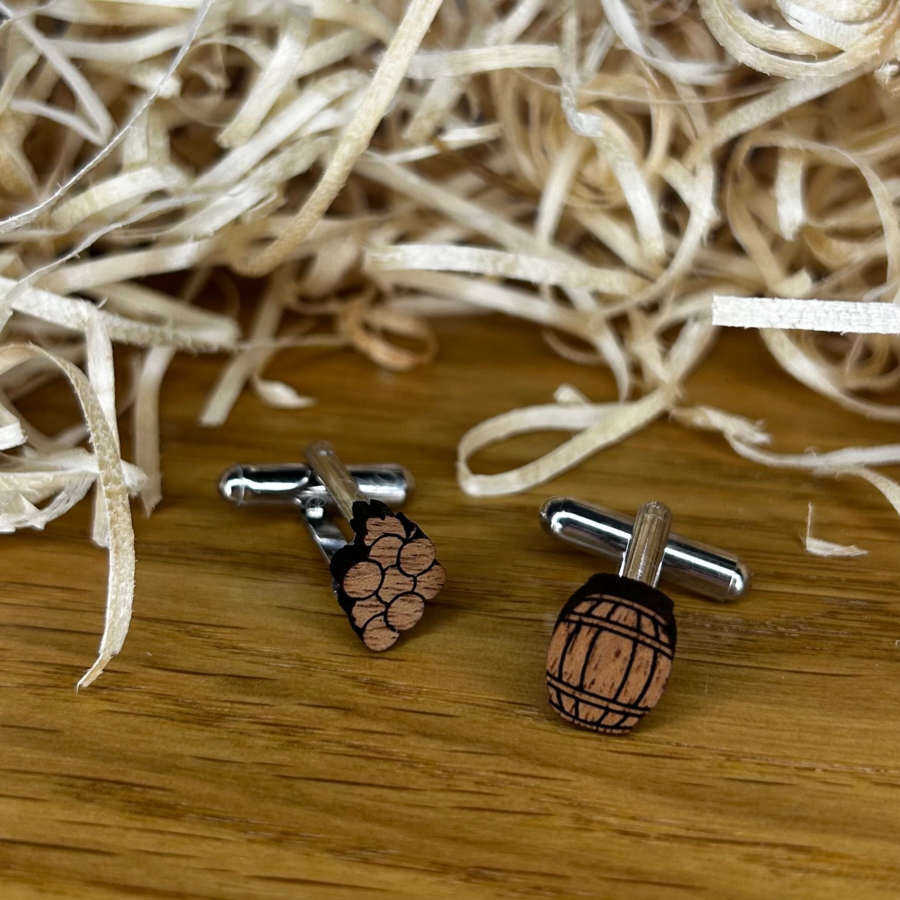 Gemelo de madera cortada con dispositivo láser. Uvas y barril.