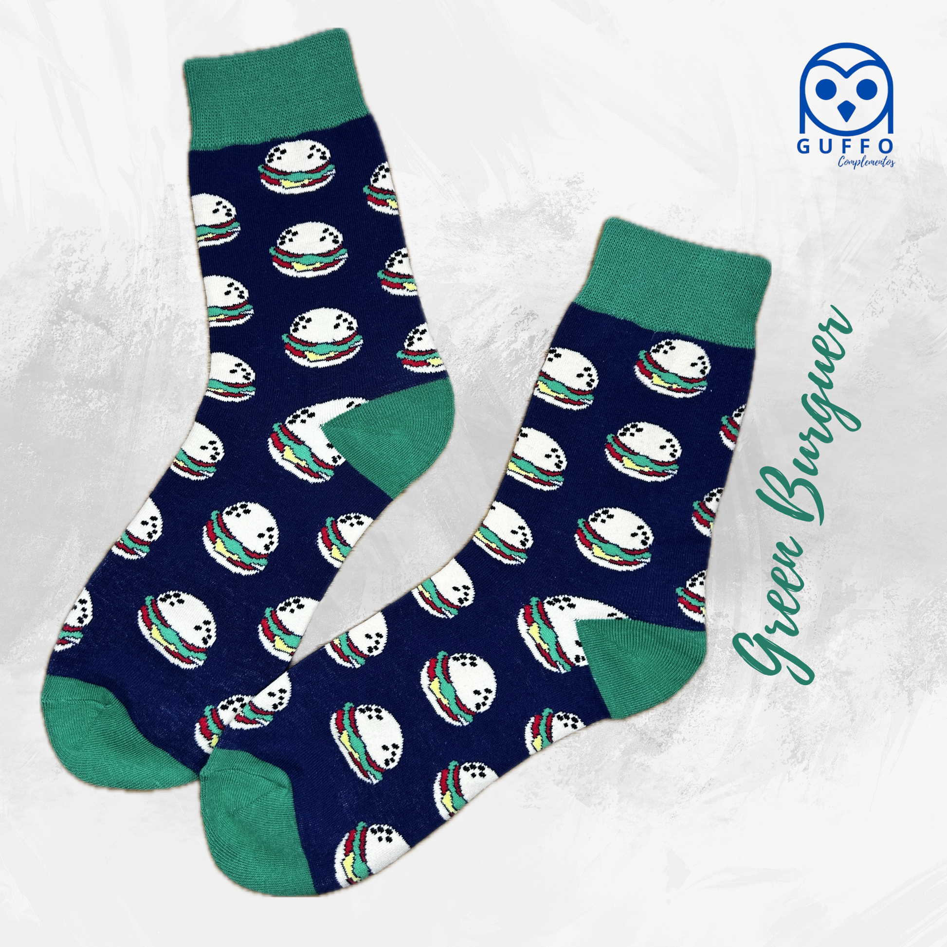 Calcetines de color azul marino con puntas y talón verdes, y un dibujo seriado de hamburguesas.