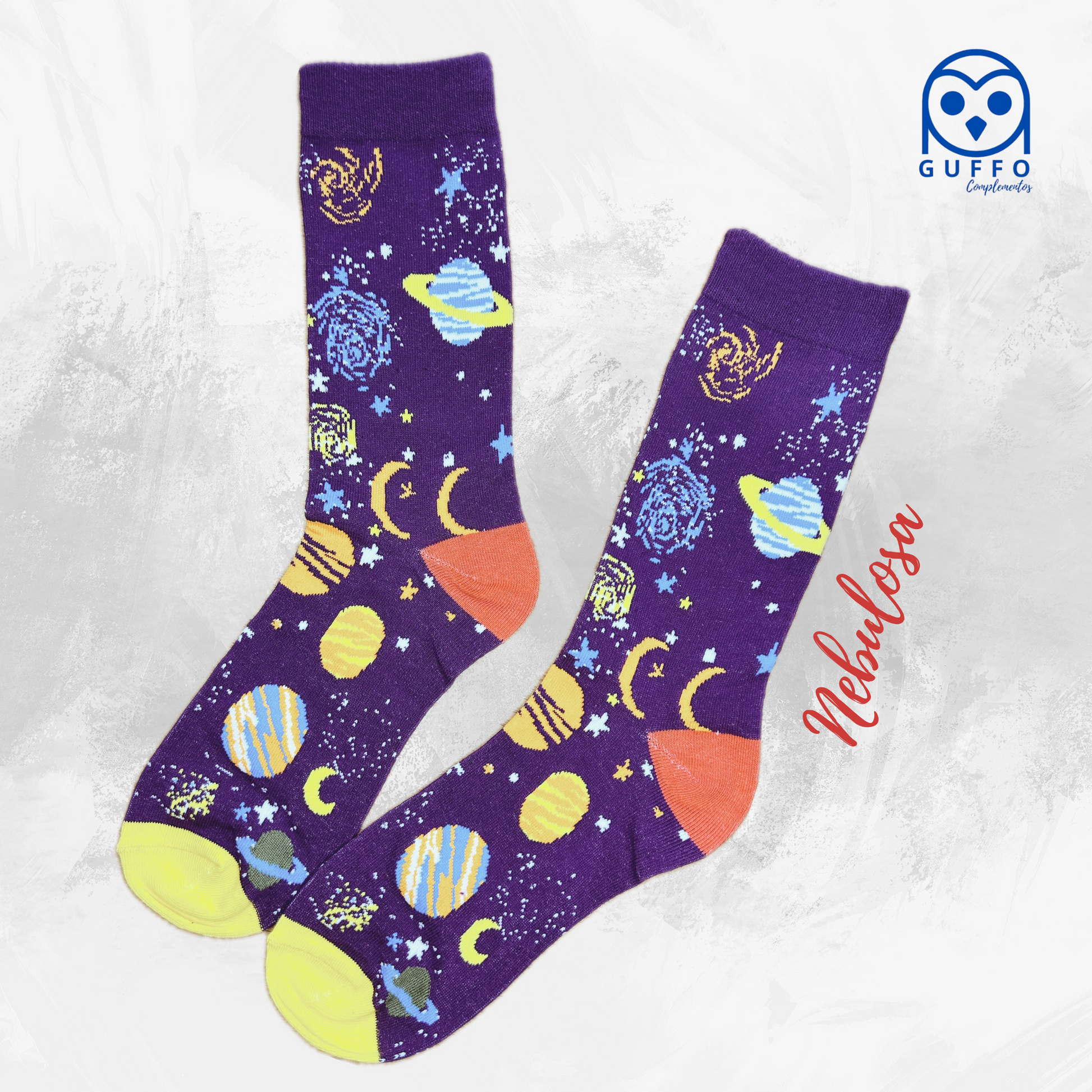 Calcetines de color morado punta amarilla y talón naranja, con un dibujo espacial.