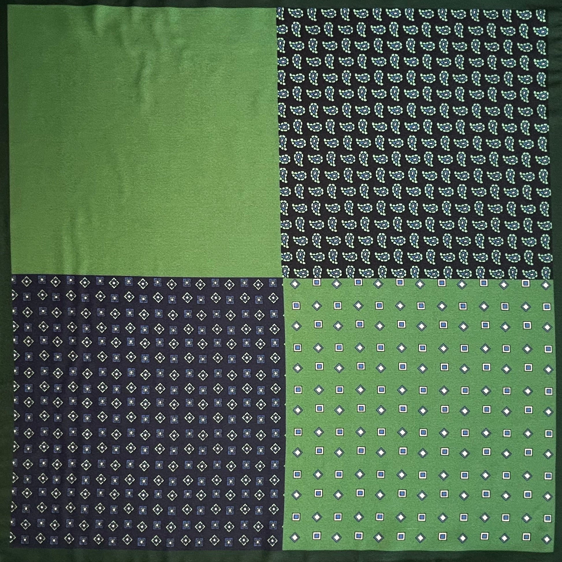 Estampado: Bonito con un estampado diferente en cada cuarto. Base base en tonos verdes y azules.