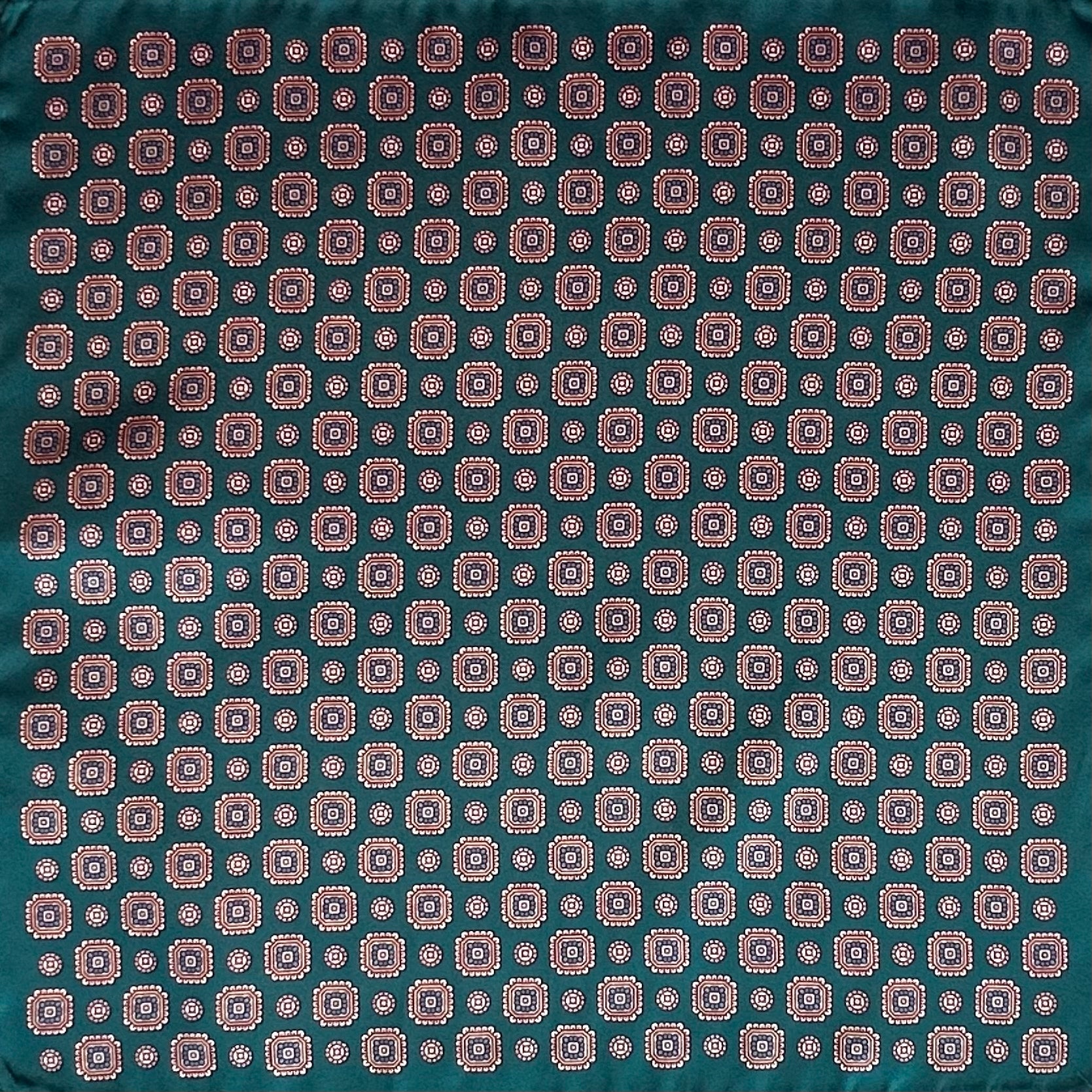 Estampado: Bonito estampado con elementos geométricos en tonos rosáceos sobre fondo verde agua.