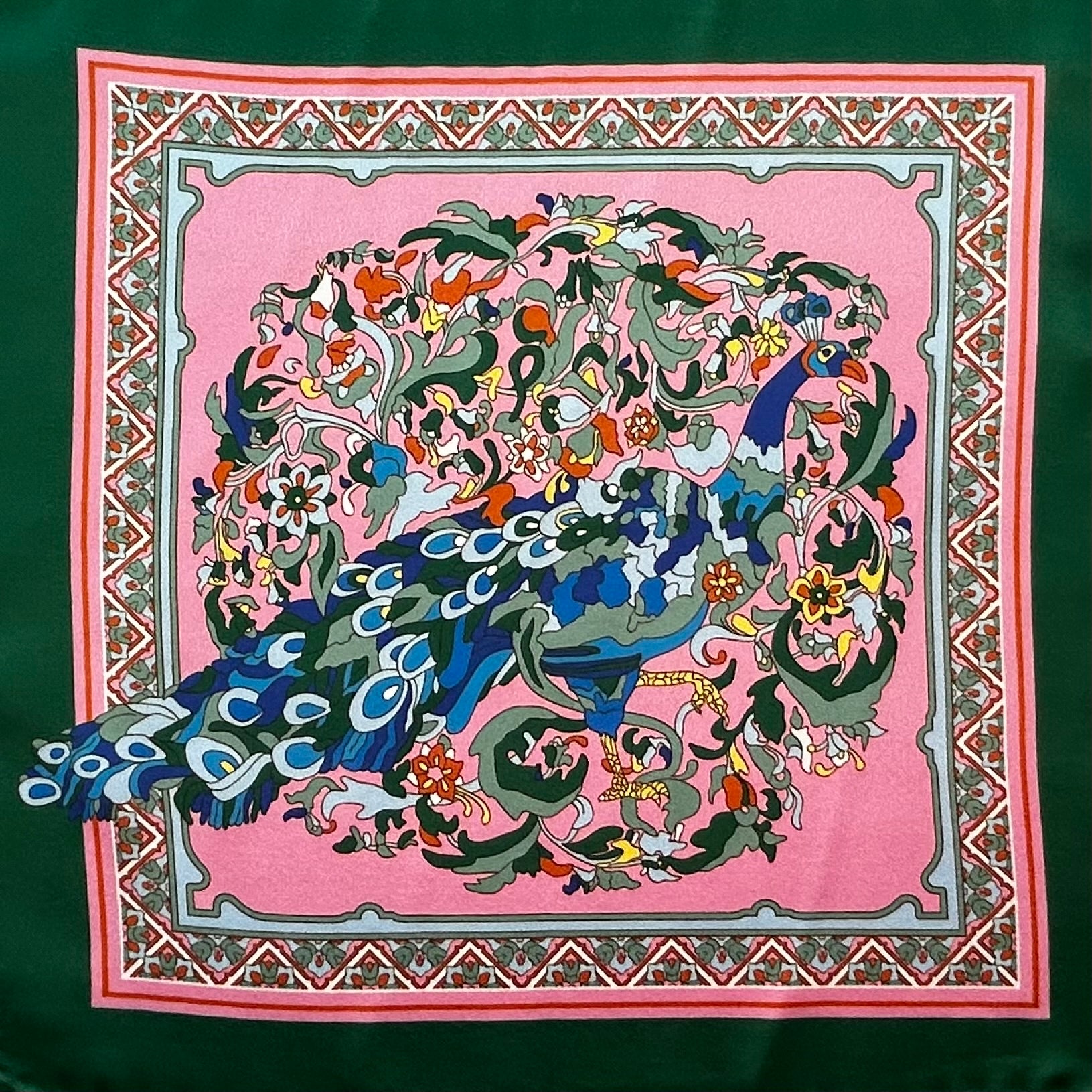Estampado: Bonito estampado con pavo real. Base verde y tonalidades rosaceas.