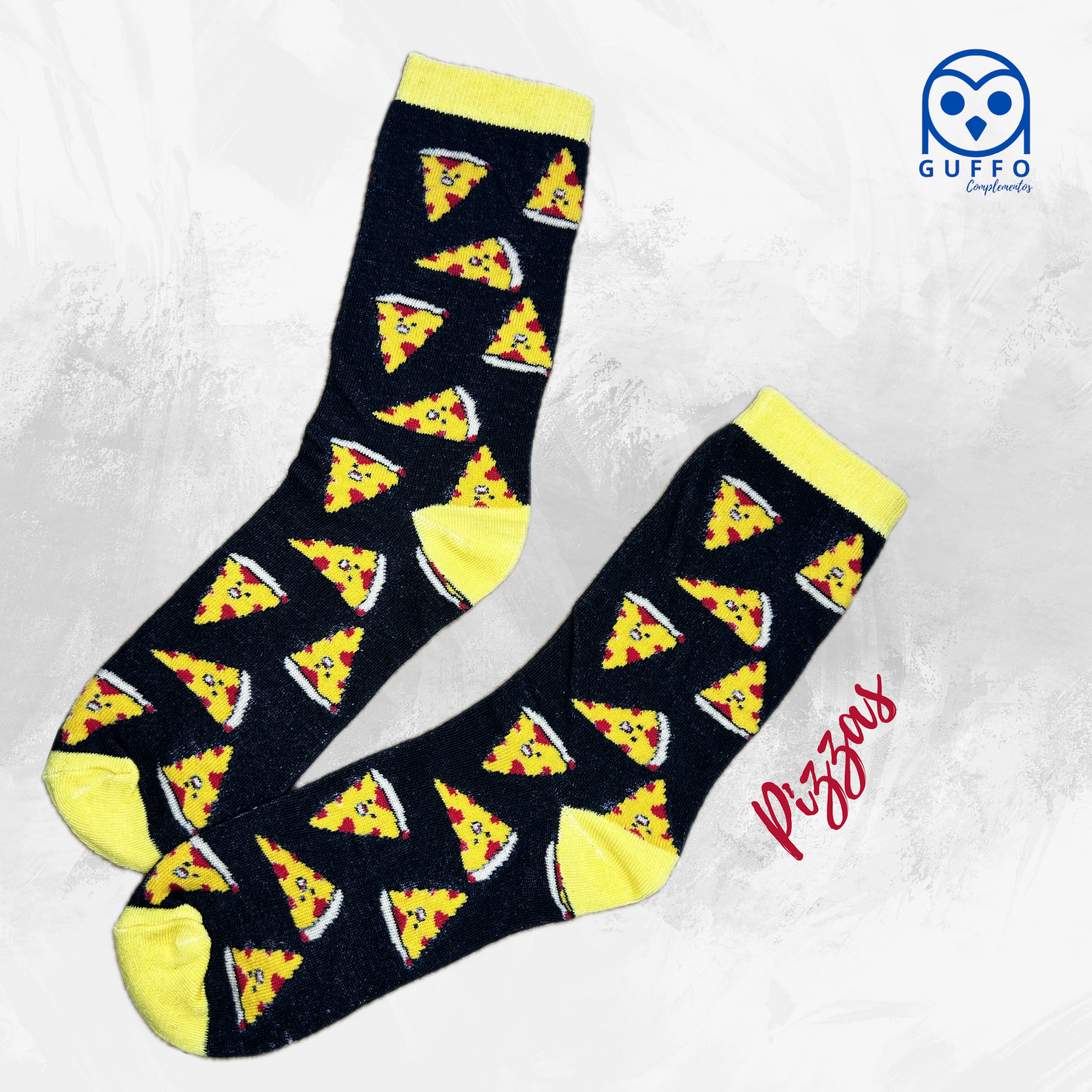 Calcetines de color negro con puntas y talón amarillos y con un dibujo seriado de motivos de pizzas.