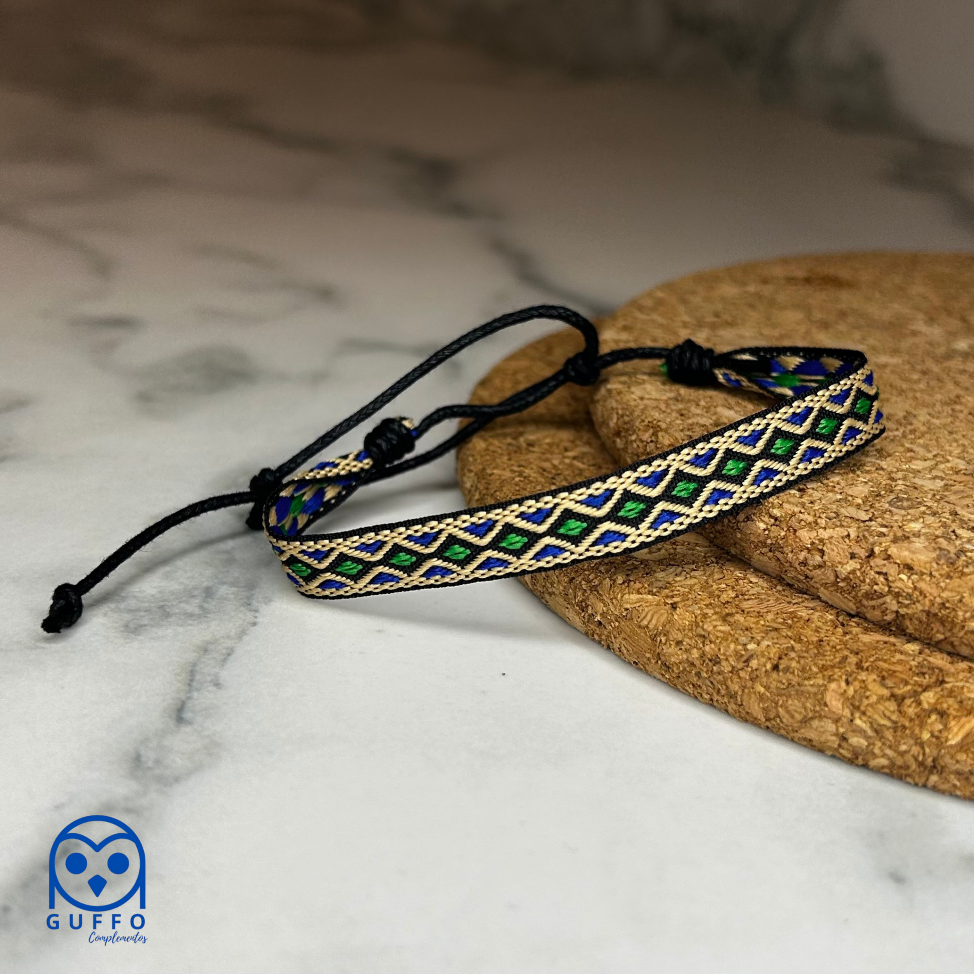 Pulsera de tela con motivos étnicos en colores azul, verde y beige y cierre ajustable .