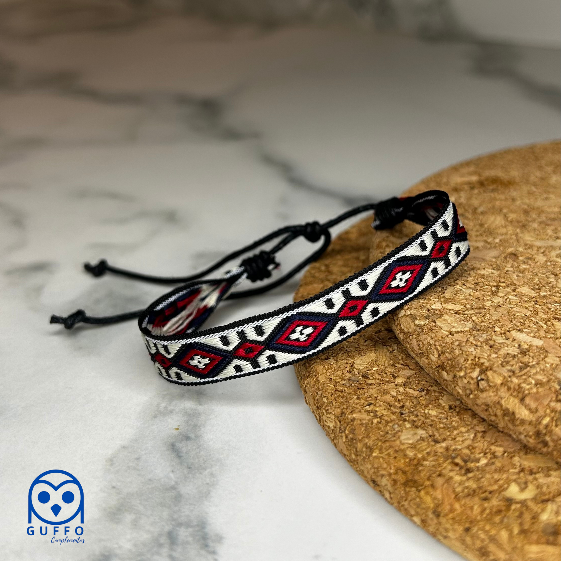 Pulsera de tela con motivos étnicos en colores azul, rojo y beige y cierre ajustable .