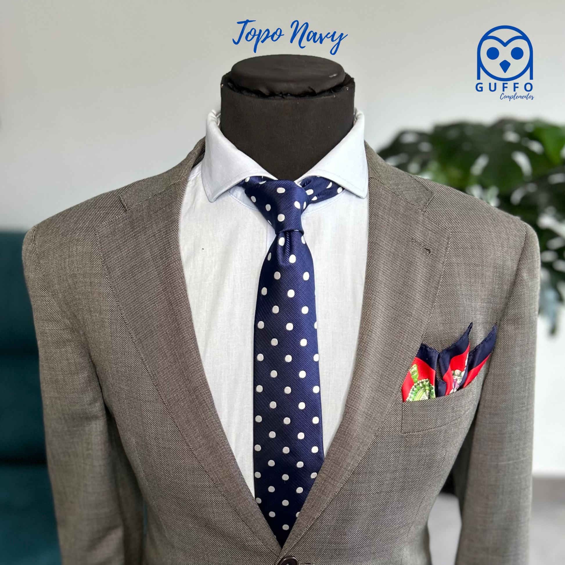 Estampado: Base azul marina con topos blancos.